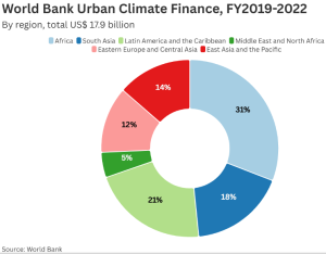 Fig 1: A figure representing the distribution of World Bank Urban Finance in regions across the World. Source: https://blogs.worldbank.org/en/sustainablecities/how-the-world-bank-is-accelerating-urban-climate-finance#:~:text=Development%20and%20climate%20adaptation%20finance,from%20shocks%20and%20build%20resilience.